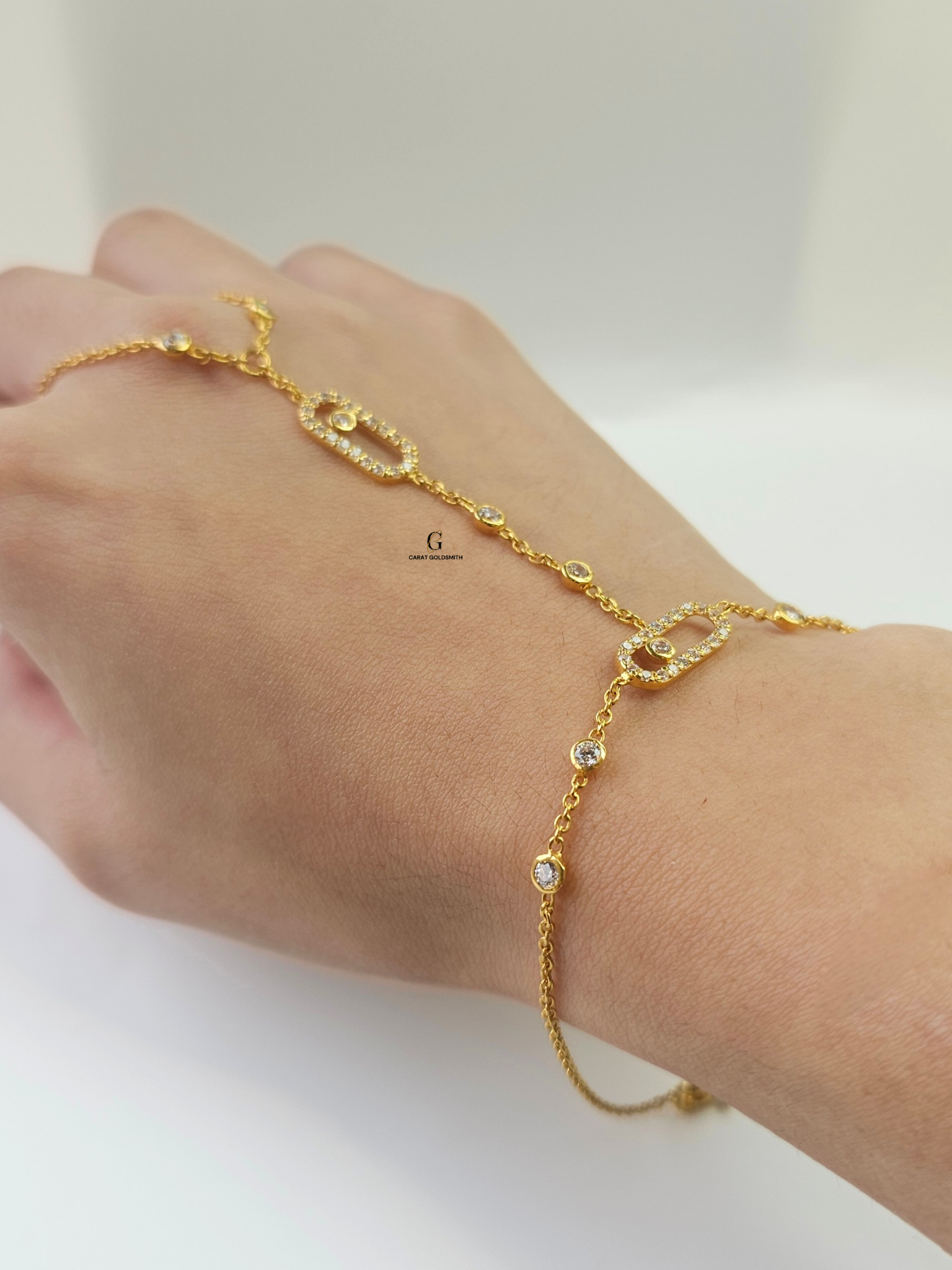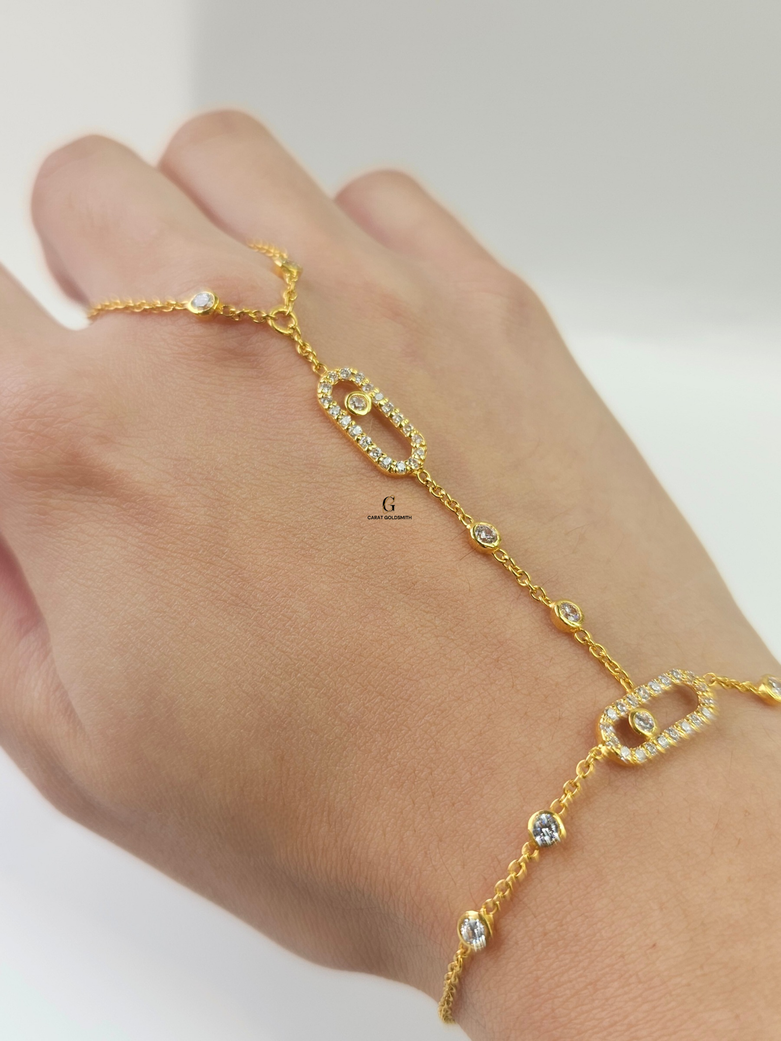 Our 22ct Cubic Zirconia Oval Stone Hand Chain creates a stunning and delicate layered look for any occasion. Layer it with rings and other bracelets and you get an elaborate look that is guaranteed to sparkle and get all the compliments.